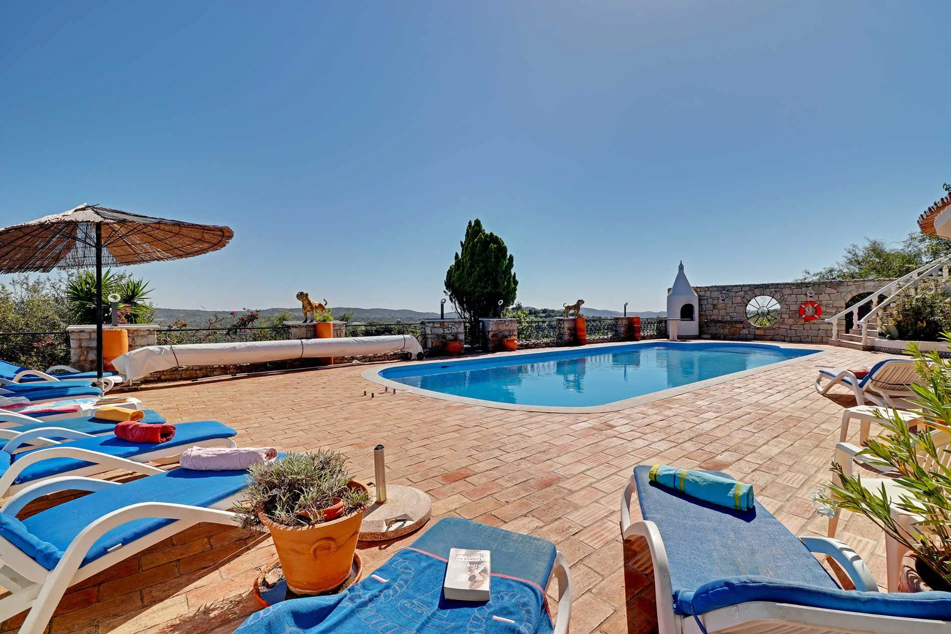 Truly relax at this unique and tranquil getaway. Perched high on a hill at the end of a private road with no near neighbours yet not isolated. Exceptional 360* views to the mountains inland and the sea toward Tavira and Olhao. Stunning terraces over 3 floors. Newly renovated March 2022 including retiled heated pool with new pool heating. 25 mins Faro airport. 25 mins to Tavira & Spain. 20 mins to Olhao, Fuseta and their beautful islands and beaches. 5 mins Sao Bras. Spectacular sunrise & sunset.